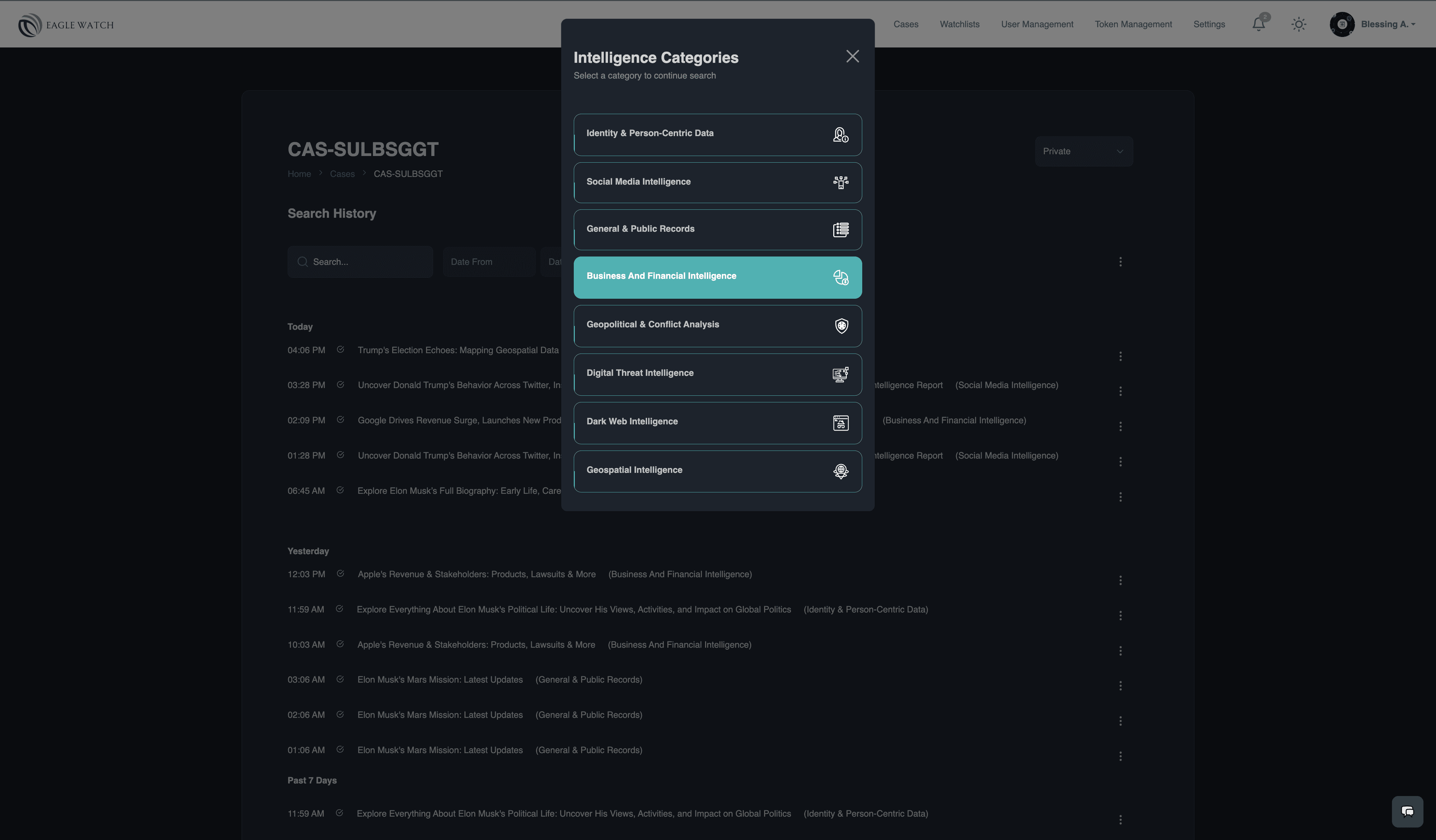 At the core of Eagle Watch is a Master Brain that autonomously interprets your search intent to deploy specialized agents across eight intelligence categories, eliminating the burden of manual investigation.